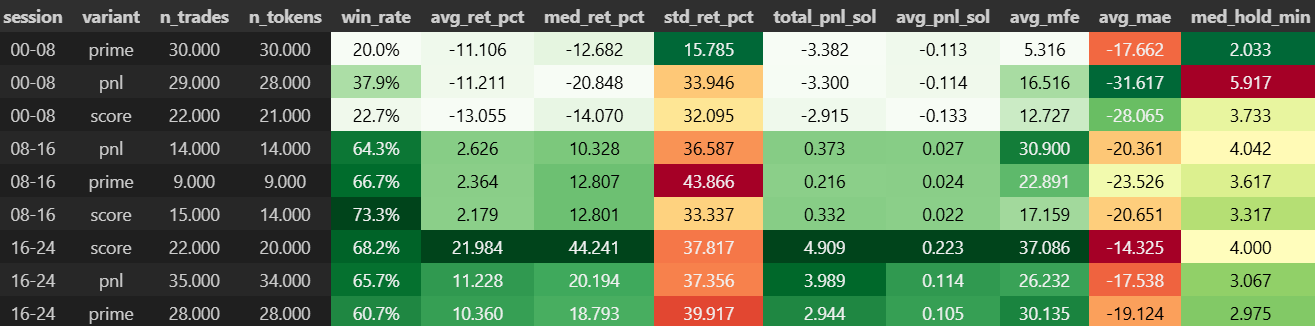 207 paper trades across 103 tokens with session-specific variants (prime, pnl, score). 16–24 emerges as the production window; 00–08 remains research-only.